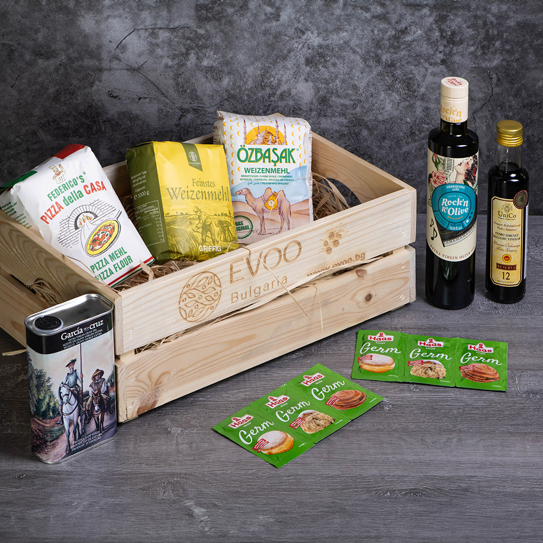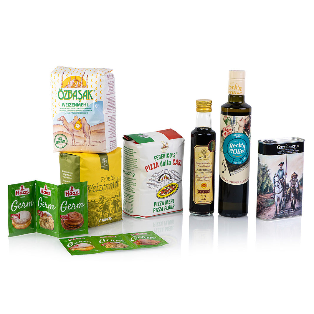 Sorgfältig ausgewähltes Set von Premium-Produkten für jeden Geschmack. Enthält 2 Flaschen außergewöhnliches Olivenöl, geprüften Balsamessig, 3 Packungen Weißmehl und Trockenhefe für Ihre Backwaren.