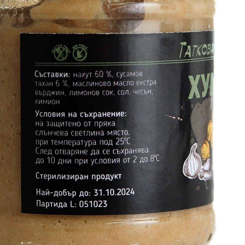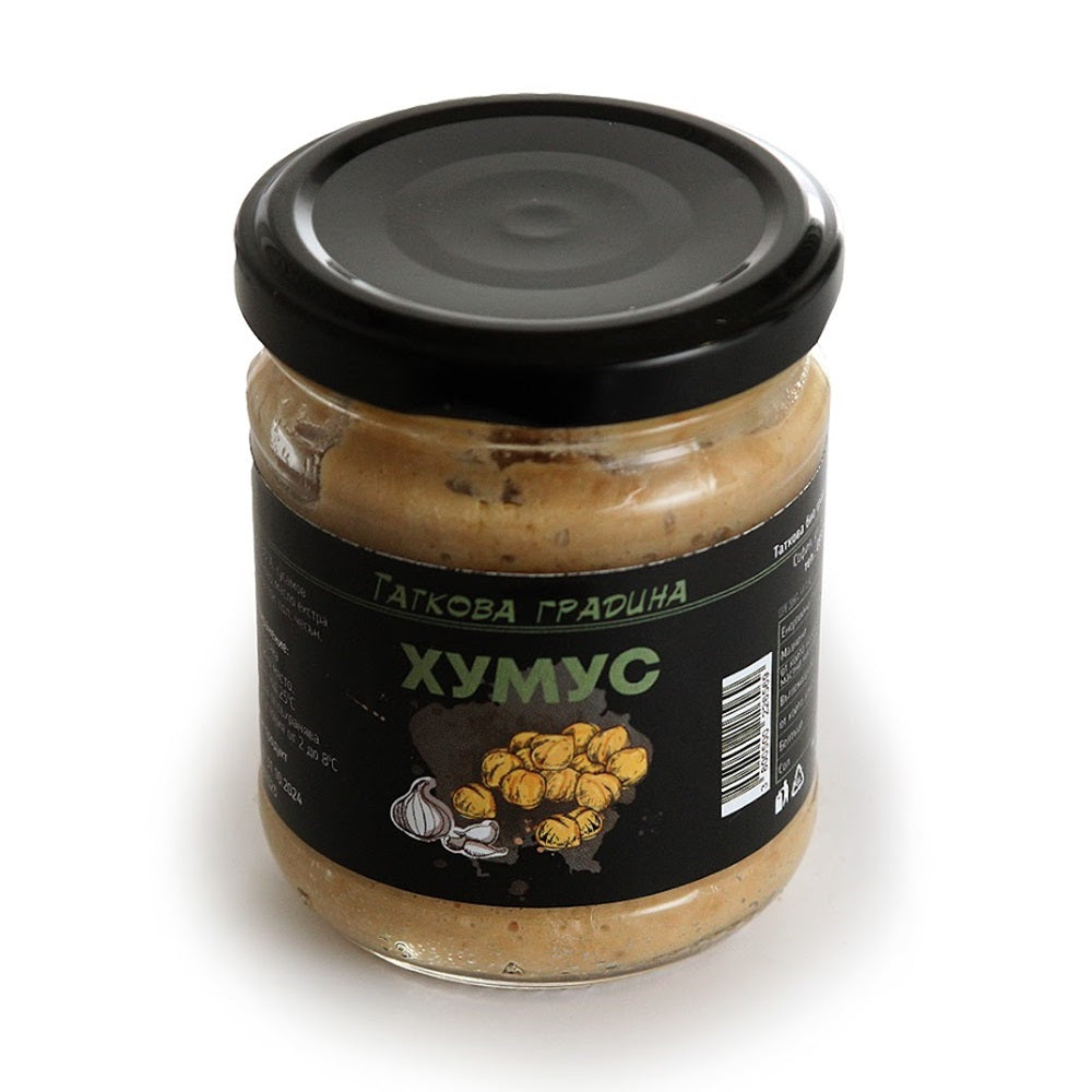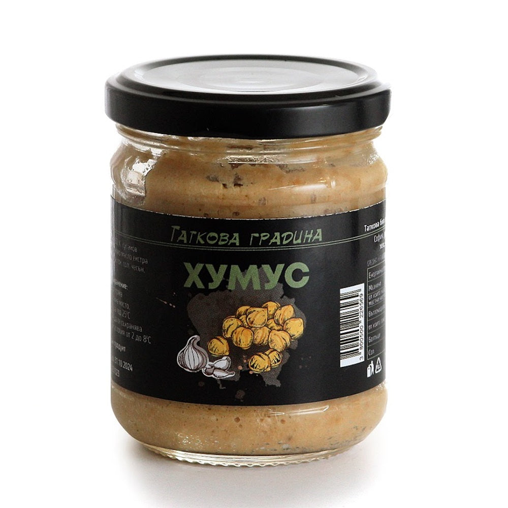 Hummus from TATKOVA BIO GRADINA is nutritious and very tasty. Hummus is a well-known food, but with a different taste. Our recipe is chickpeas with sesame tahini, walnut, garlic, a fine aroma of oregano, and extra virgin olive oil OLEOCAMPO. Sterilized product. Contains no preservatives.