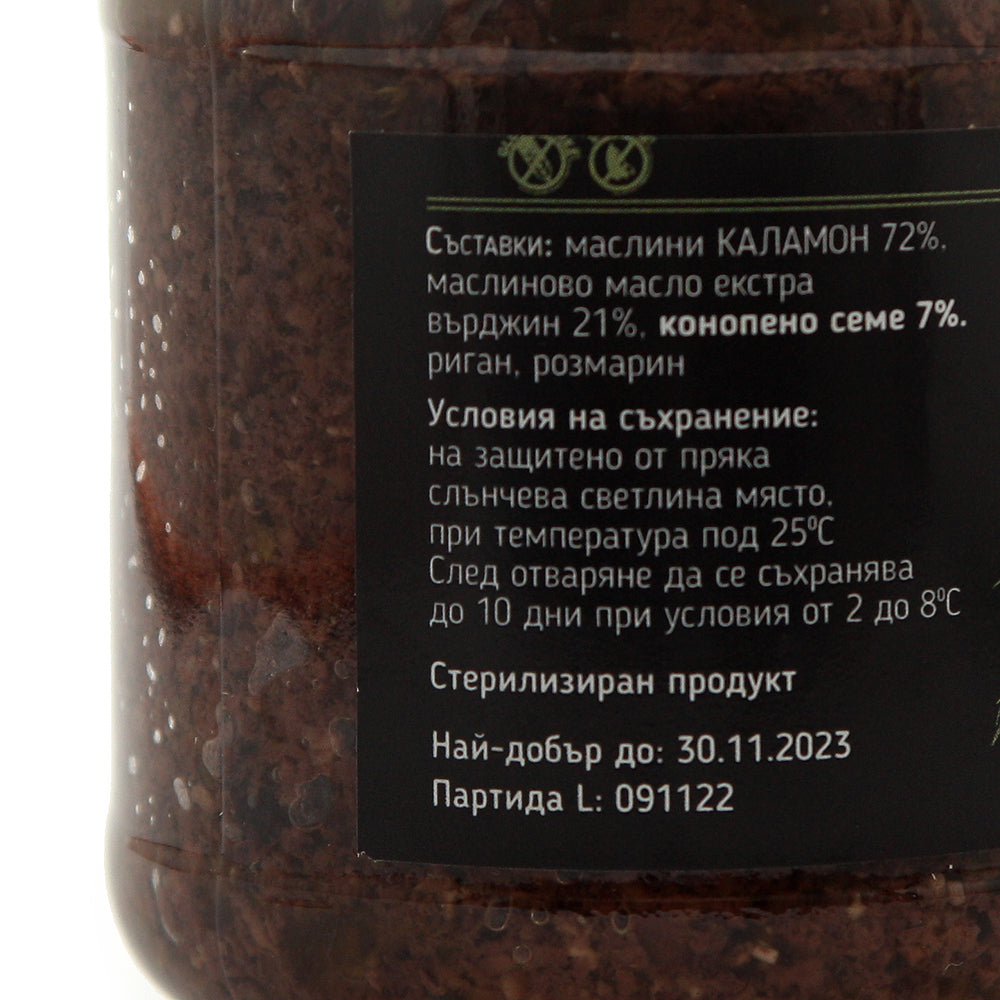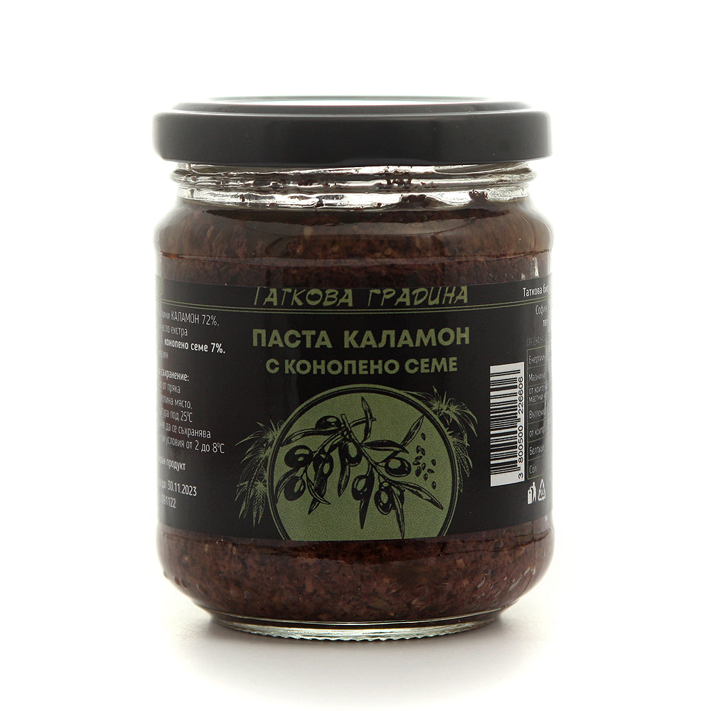 KALAMON Paste with hemp seed, from TATKOVA BIO GRADINA is a product with KALAMON olive with a fine and balanced taste, with a delicate aroma of thyme and rosemary. The added hemp seed complements the richness and softness of the flavor. It supplements the daily need of the body with proteins and saturated fatty acids. Suitable for direct consumption. Sterilized product. Contains no preservatives.