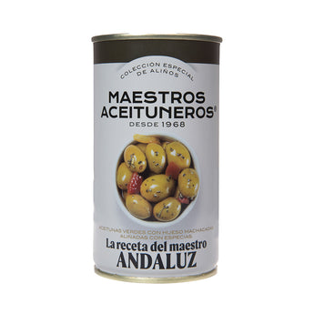 Măsline ANDALUZ sunt măsline verzi tăiate cu sâmbure, condimentate cu un dressing de condimente după o rețetă maestră din Andaluzia. Veți simți gustul de piper negru, boia și usturoi.